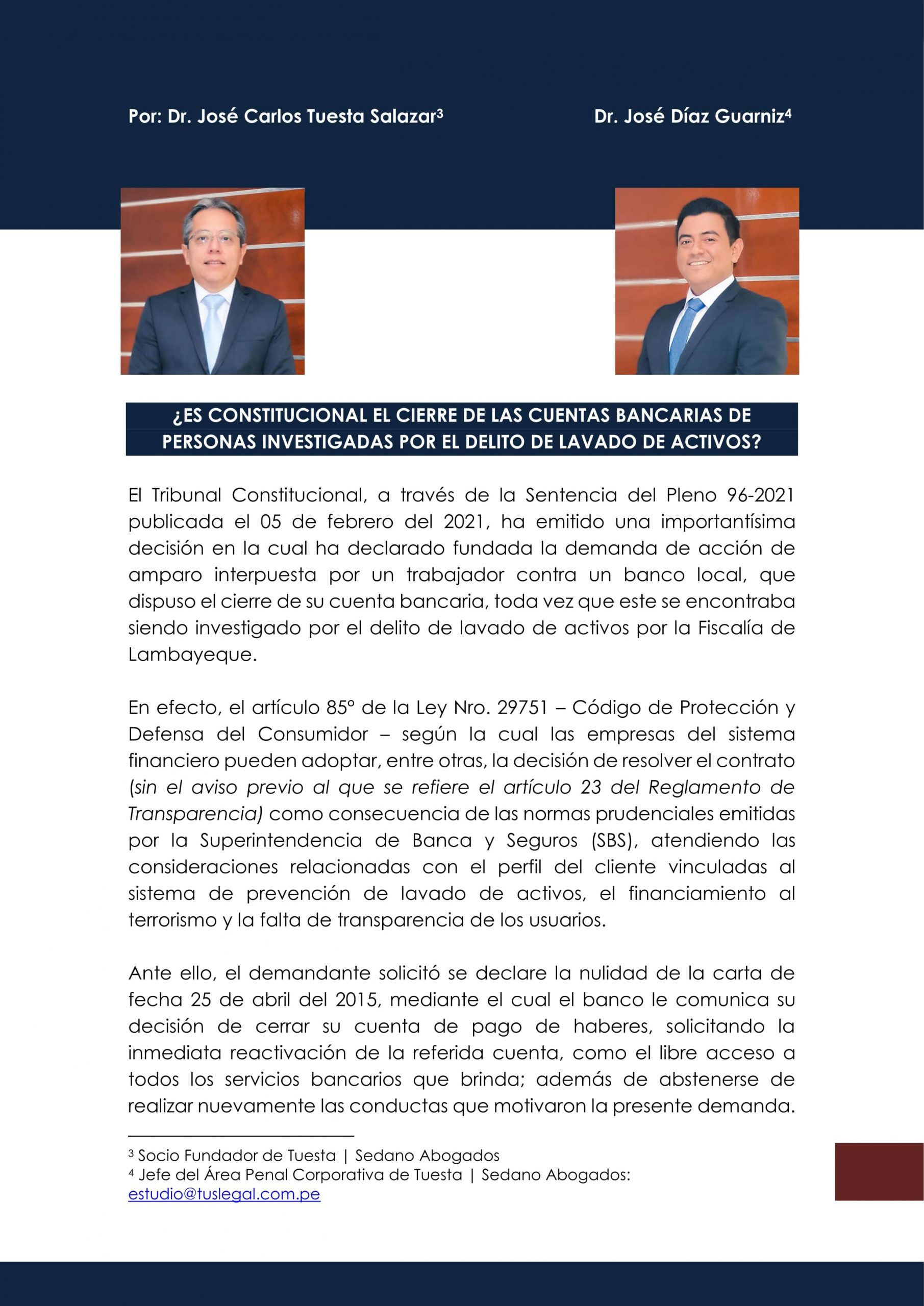 Compartimos interesante artículo publicado por el Boletín de la Cámara de Comercio de La Libertad, denominado ¿Es constitucional el cierre de las cuentas bancarias de personas investigadas por el delito de lavado de activos?, la cual ha sido realizada por el Dr. José Carlos Tuesta, Socio Fundador y el Dr. José Díaz, Jefe del Área Penal Corporativa del estudio.