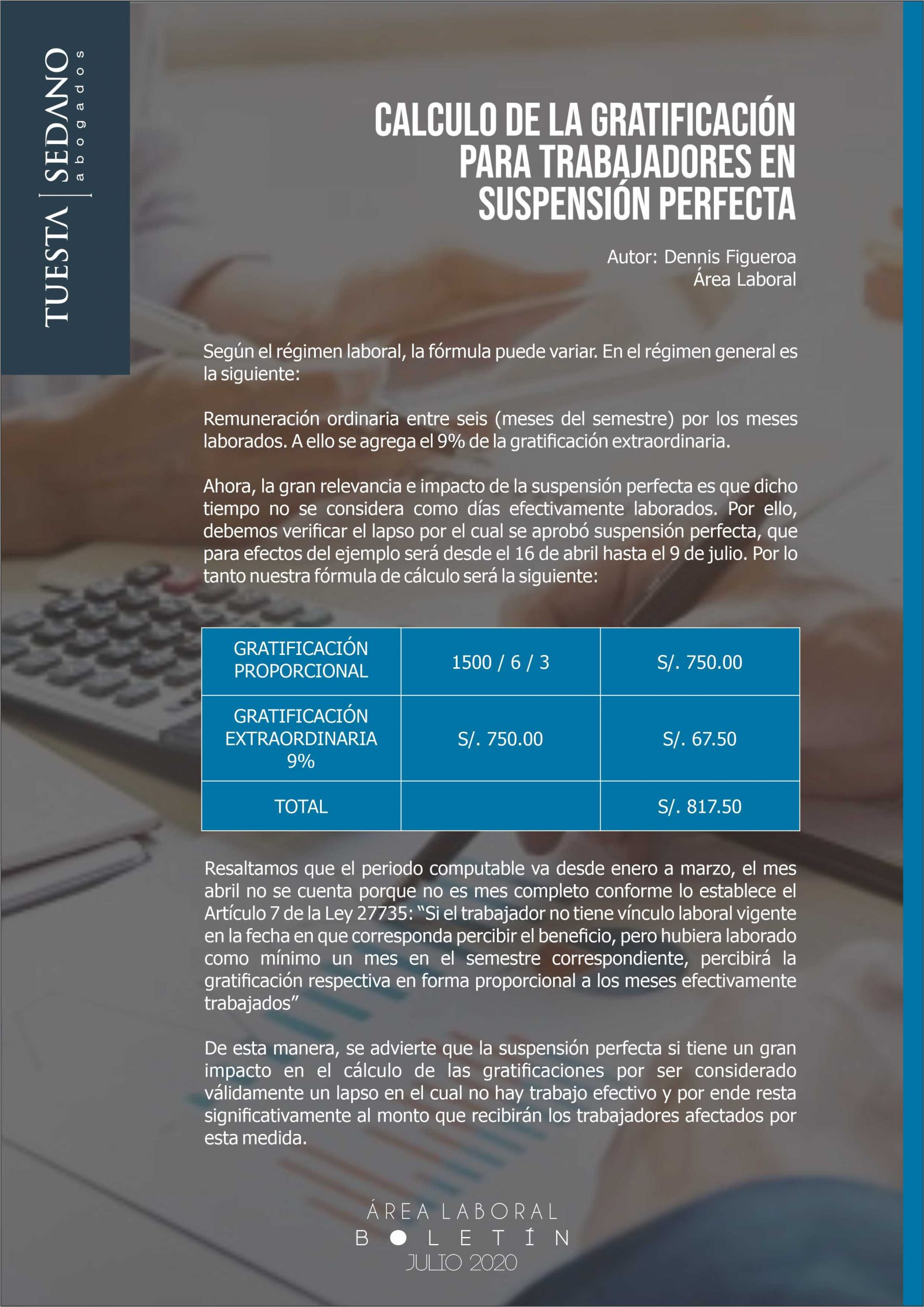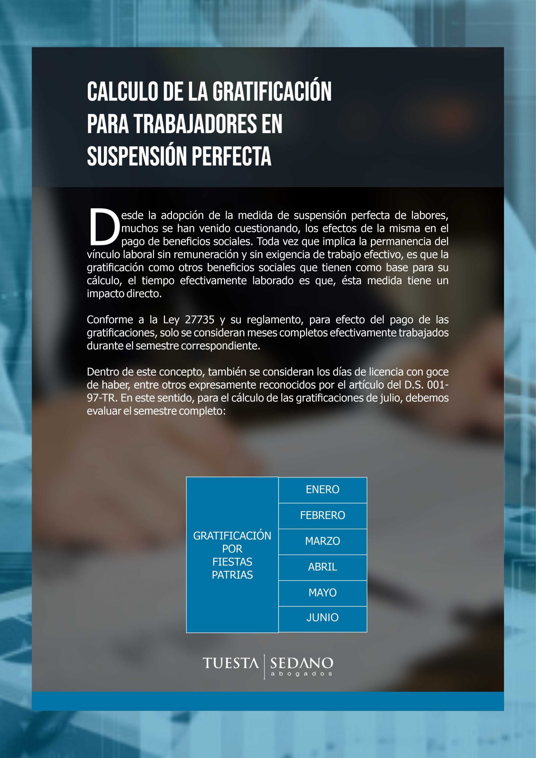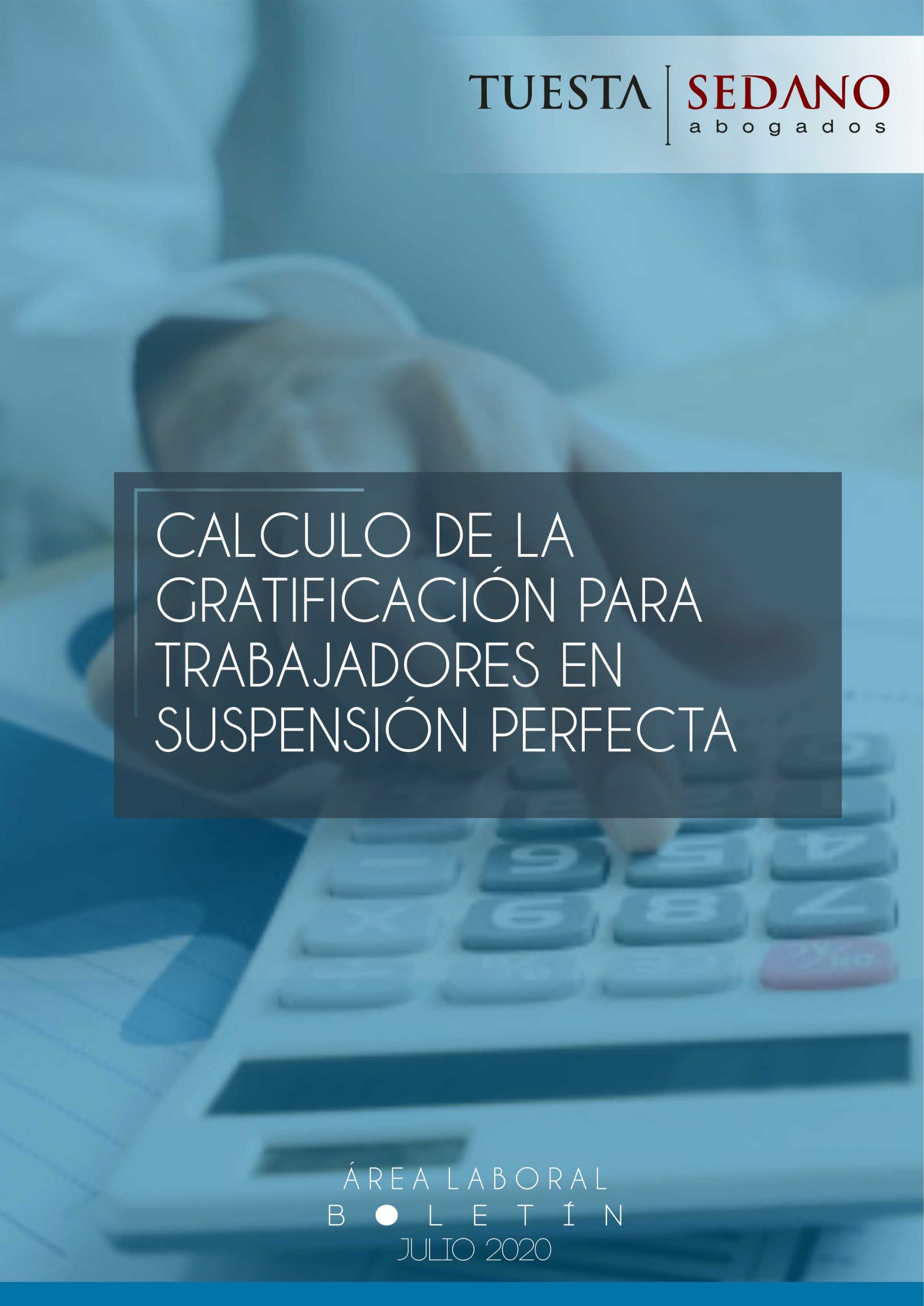 Ponemos a disposición un relevante informe referente al Calculo de la Gratificación para Trabajadores en Suspensión Perfecta, el cual ha sido elaborado por el Dr. Dennis Figueroa, del Área Laboral del estudio Tuesta | Sedano abogados