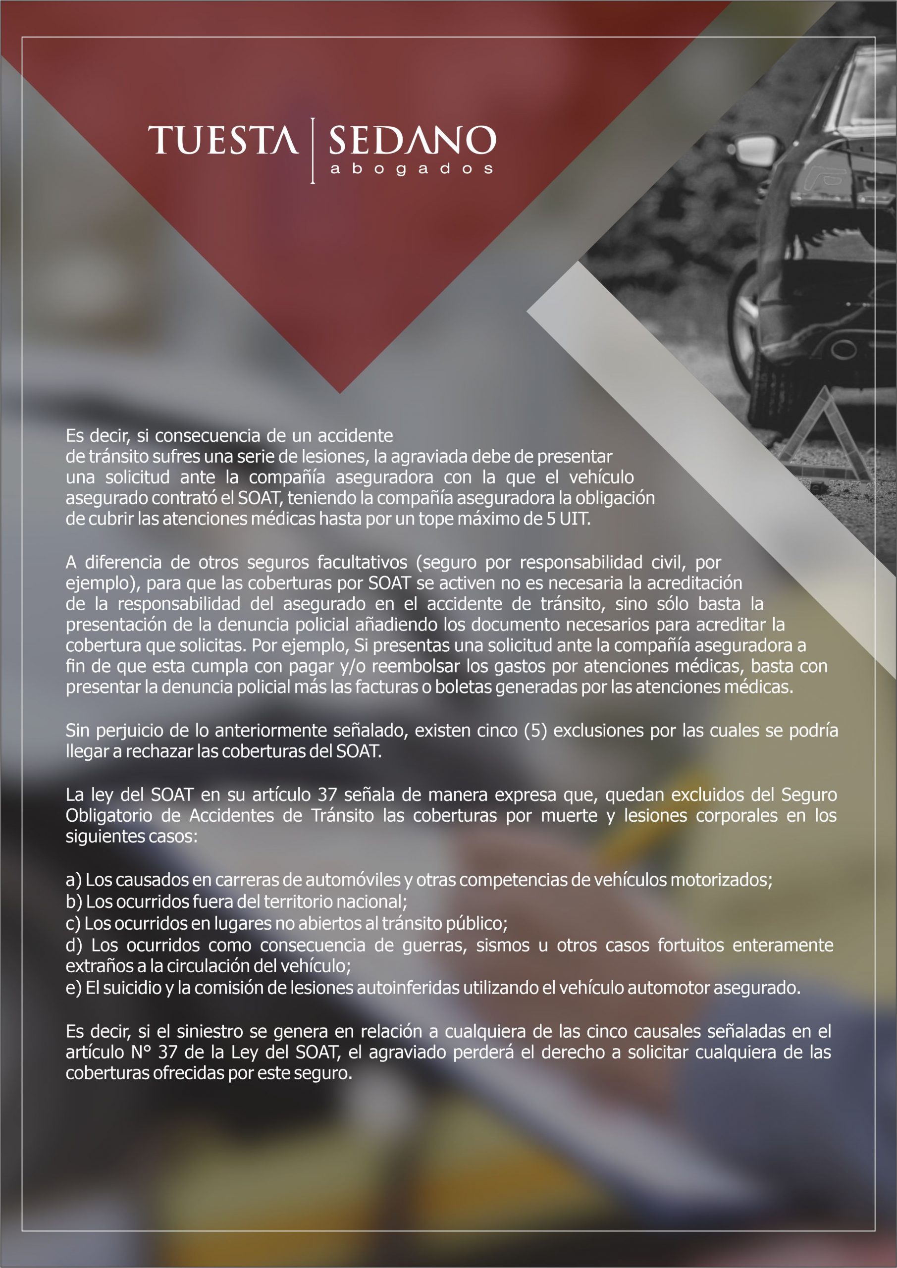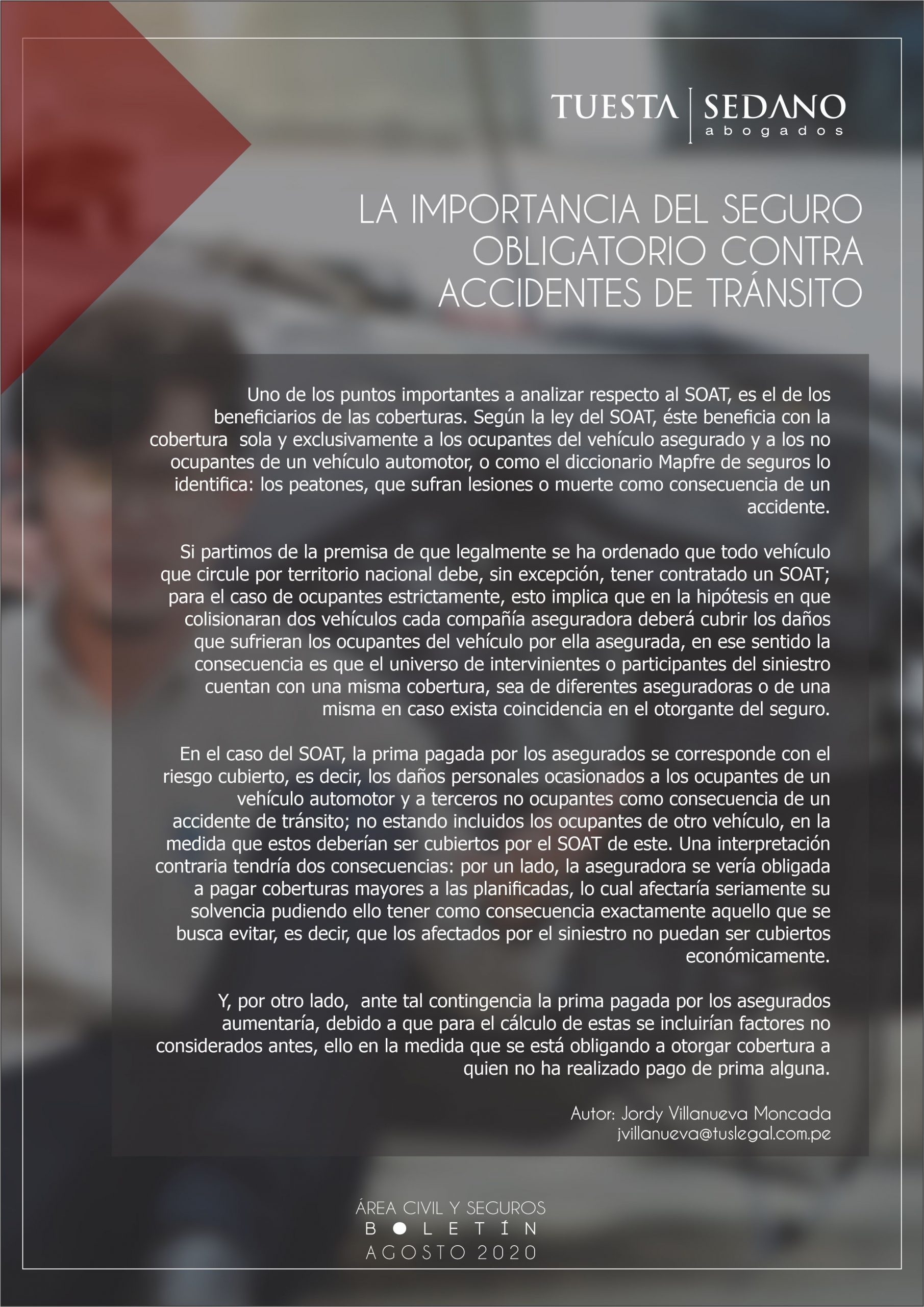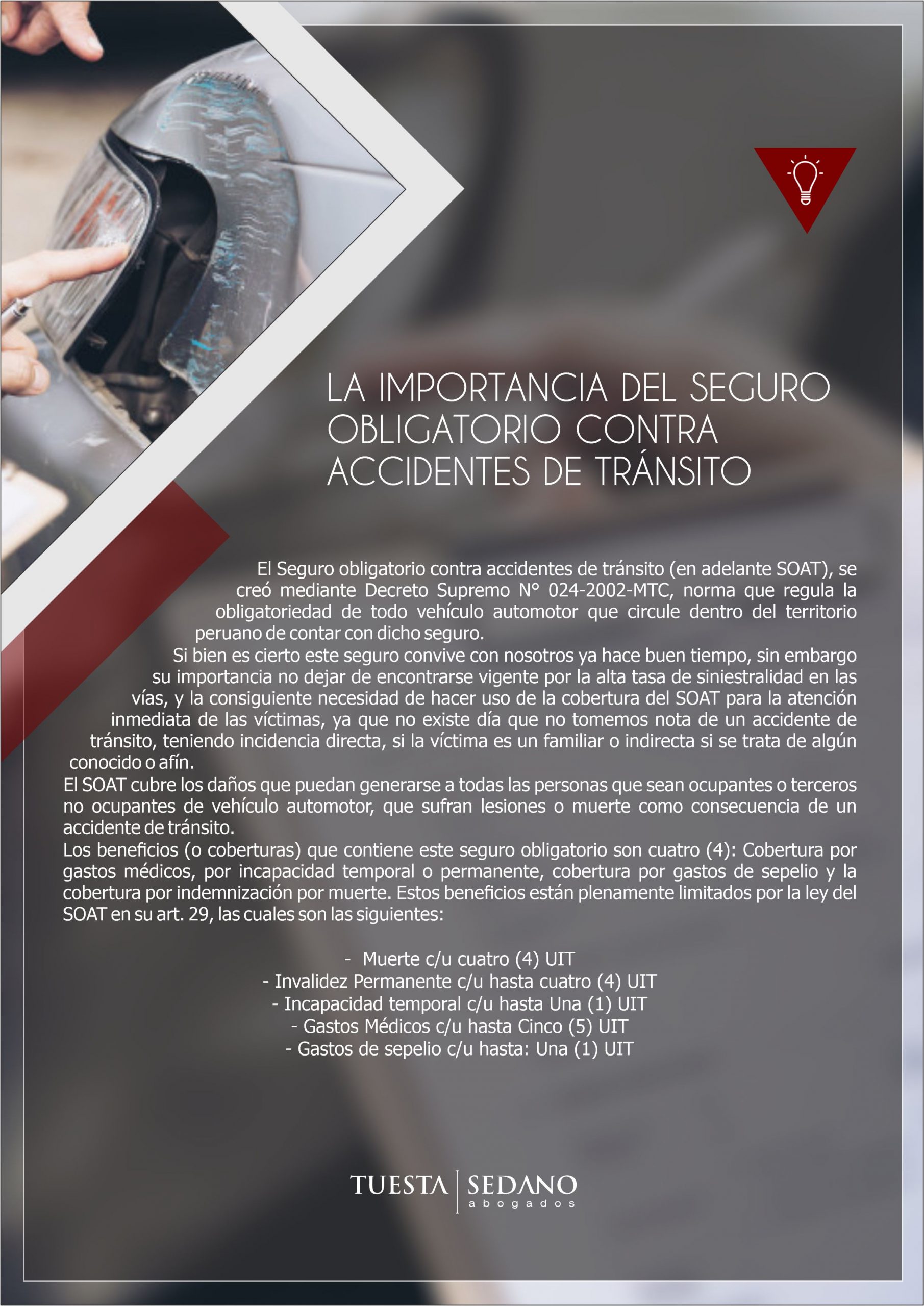 Ponemos a disposición un relevante informe referente a La Importancia del Seguro Obligatorio Contra Accidentes de Tránsito, el cual ha sido elaborado por el Dr. Jordy Villanueva Moncada, del Área Civil del estudio Tuesta | Sedano abogados